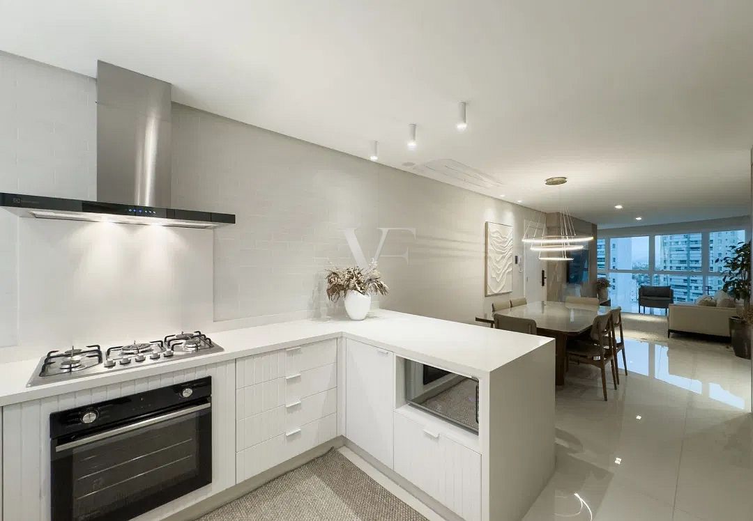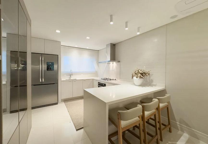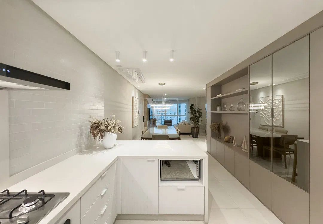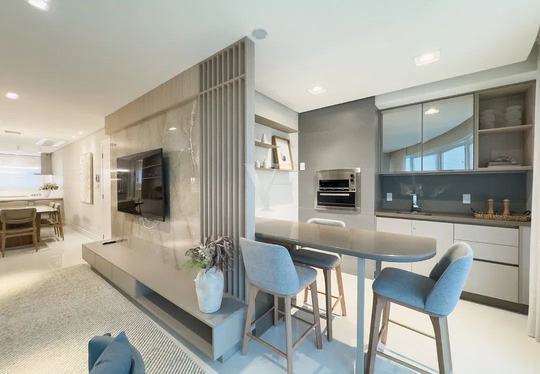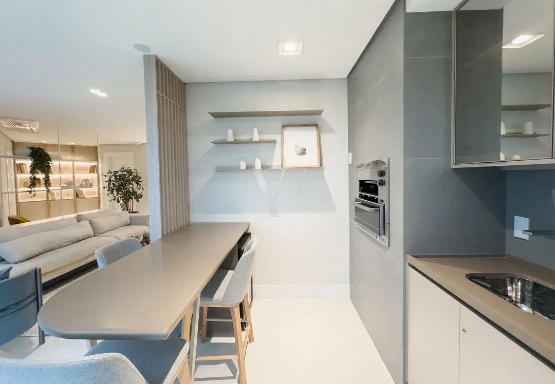 A área social é composta por living amplo para estar e jantar, com layout que favorece a convivência e valoriza a entrada de luz. A cozinha, funcional e bem posicionada, conecta-se de forma harmoniosa ao espaço principal, mantendo praticidade no dia a dia.